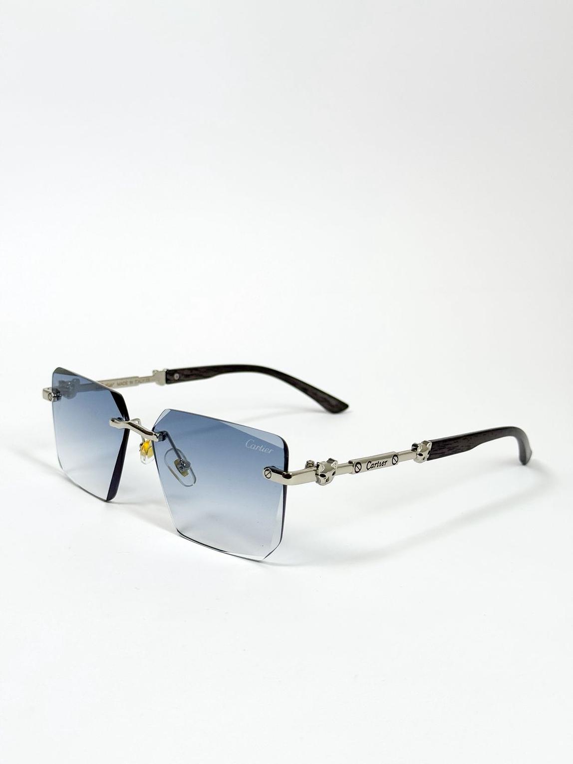 Luxurious rimless optical frames crafted in silver-toned metal, featuring the emblematic three-dimensional pouncing panther head sculpture on the temples, with dark composite ear tips.