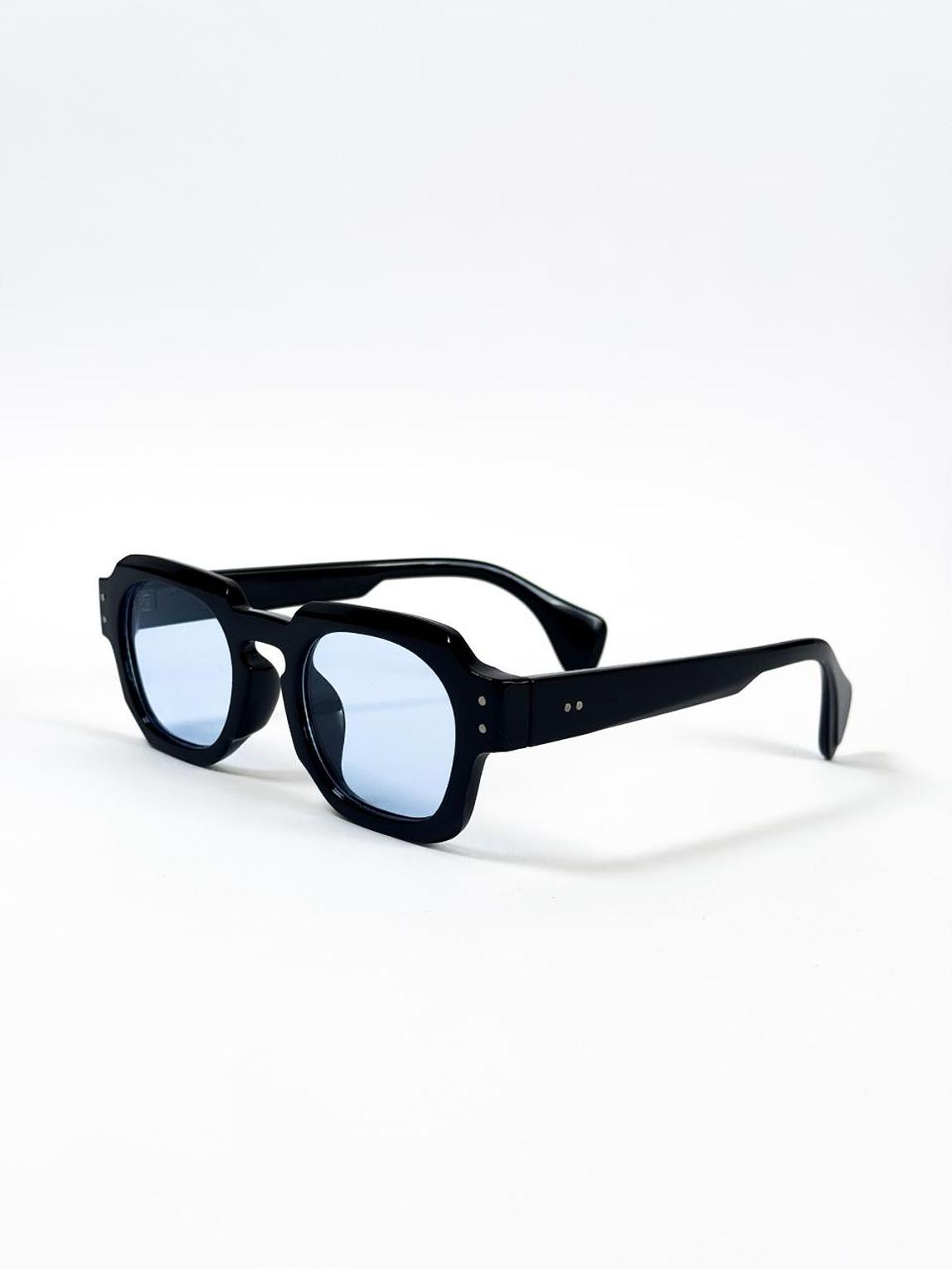 These bold black shades feature a unique, multi-sided geometric lens shape for a cutting-edge aesthetic. The light azure blue lenses introduce a surprising pop of color, making them a distinctive modern accessory.