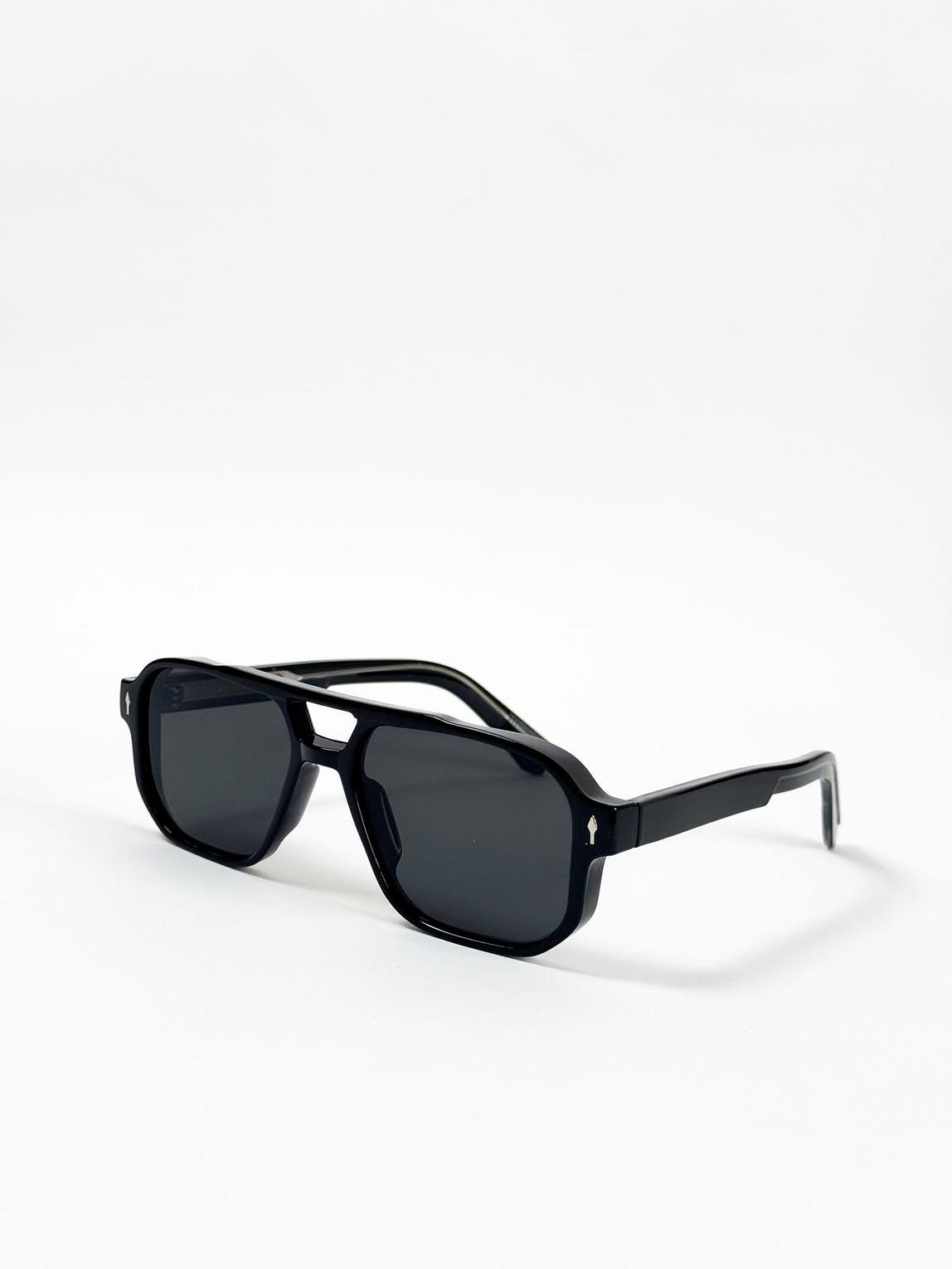 These bold sunglasses modernize the classic aviator style with a striking geometric lens shape and flat top bar. Finished in sleek black acetate, they feature a subtle signature arrow motif on the temple for an added touch of distinction.