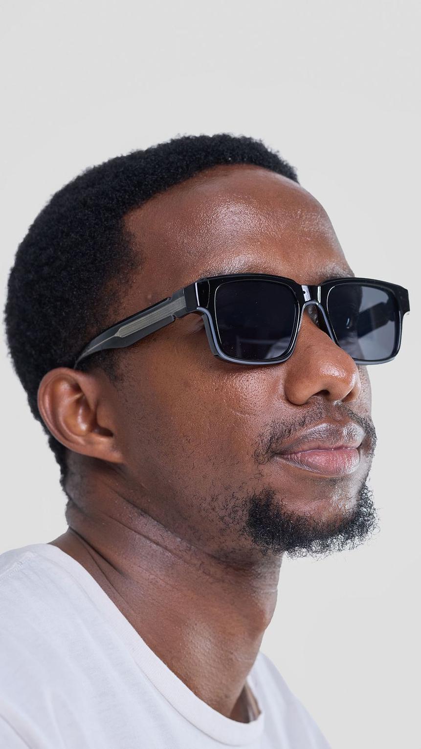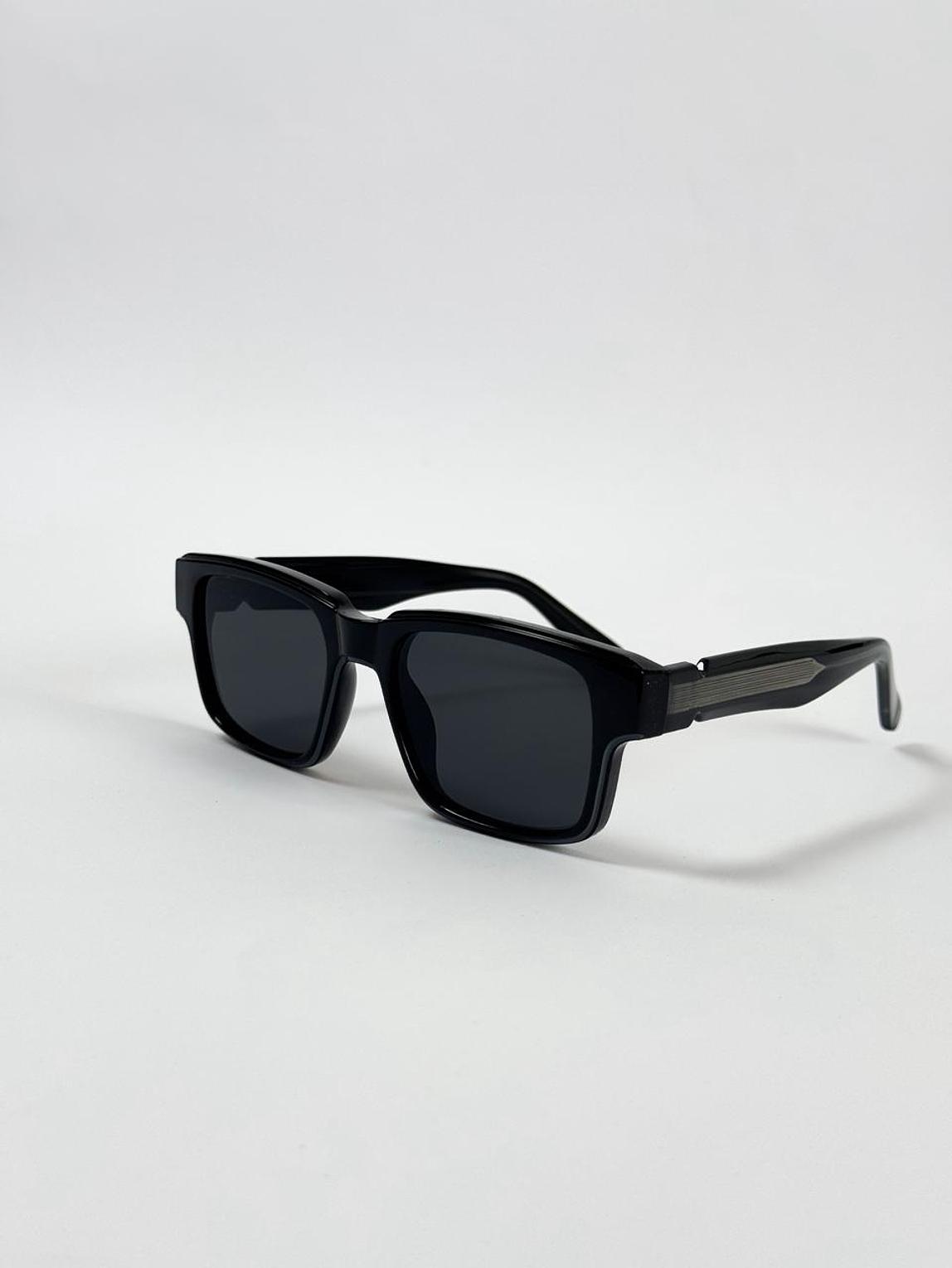 These bold, rectangular sunglasses offer a strong silhouette in deep black acetate for a definitive urban look. A distinct metallic stripe detail on the arm adds a modern, architectural edge to the classic design.